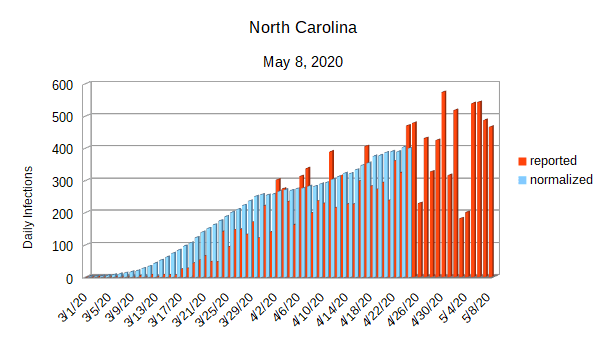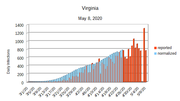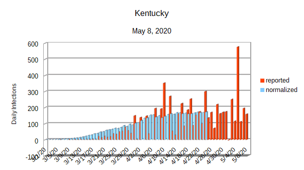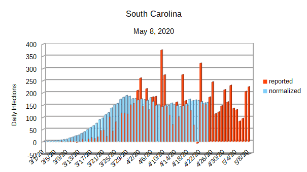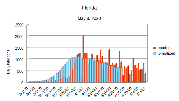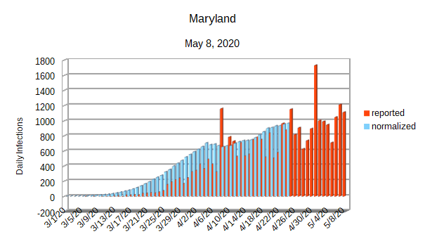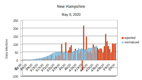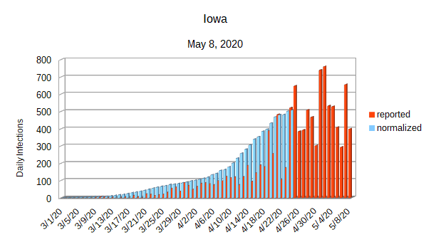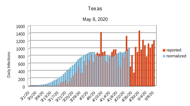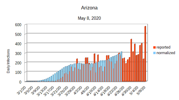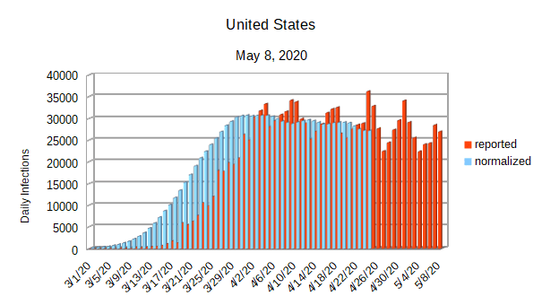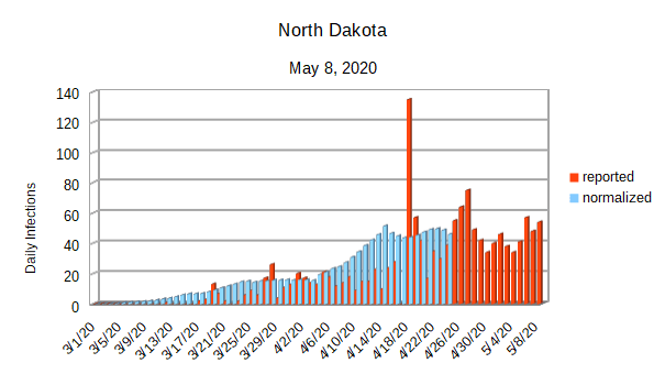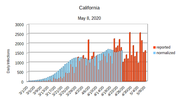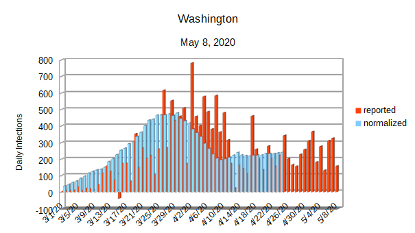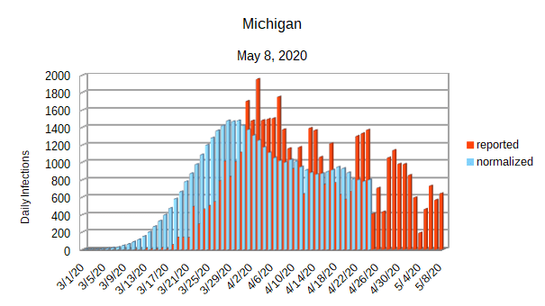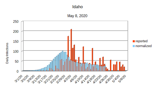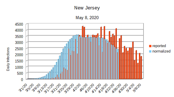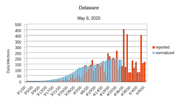 Each normalized data set is created by taking the raw data reported from the daily infection rate, using a skewed normal function to estimate the actual time the person was infected, and recording the results as a separate data set. For clarity purposes, when I create a graph, I include the raw daily infection rate in addition to the normalized daily infection rate.