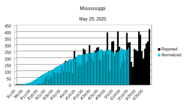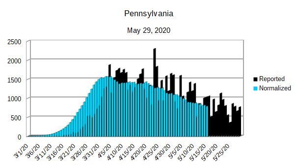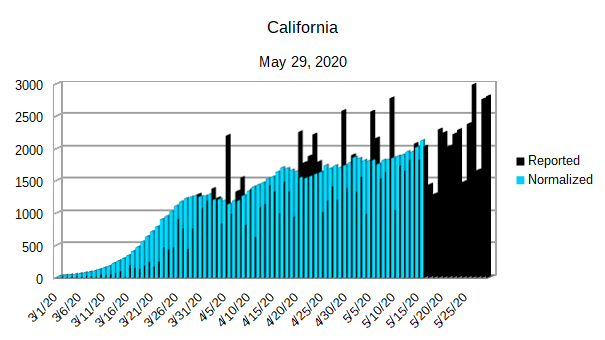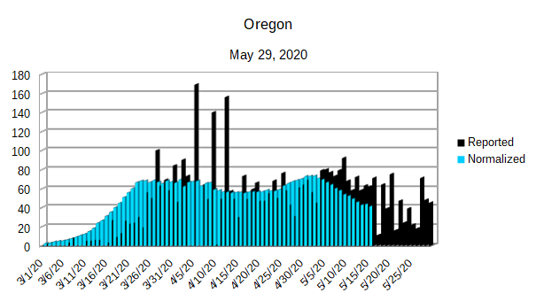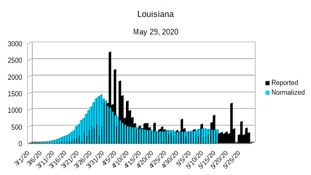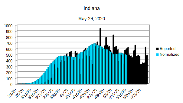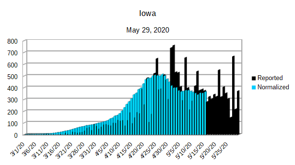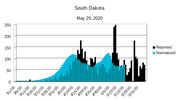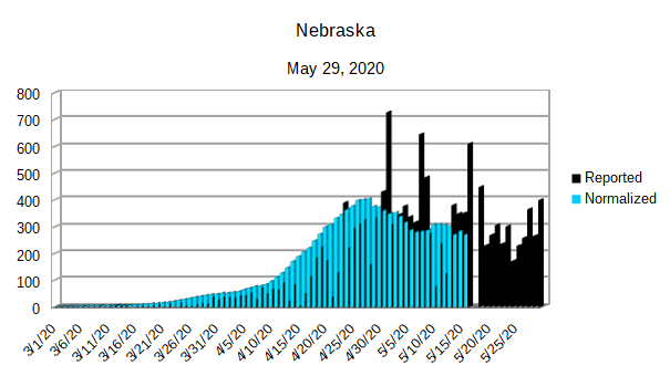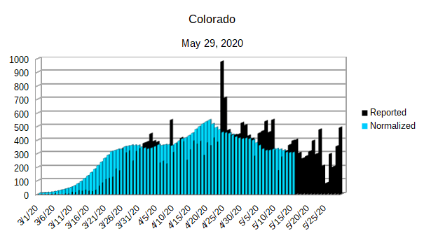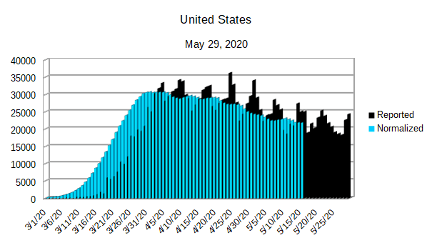 From a perspective of the entire United States, the daily infections still seem to be trending down. That said, it looks like the curve is going down less than it has been in recent weeks. If this turns out to be the case, then we might be leveling off to a steady background infection rate that could continue through the summer and into fall. While I am not a medical professional, that wouldn’t seem to be all that surprising considering what I have read from infectious disease researchers. When a novel (never having existed before) infection becomes a pandemic, there is no natural resistance to the disease and therefore there are so many people susceptible to the disease that herd immunity doesn’t initially come into play. The means that the infection can spread even in less-than-ideal conditions. And with how easy covid-19 spreads from person to person — at least in ideal conditions — it might not go away through the summer even if it is more of a seasonal infection.