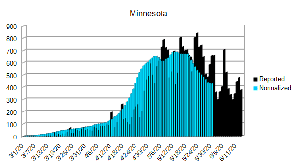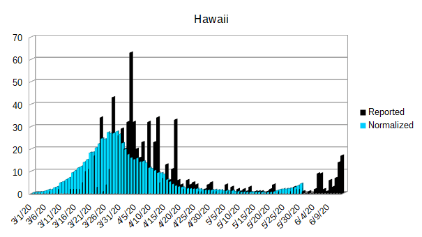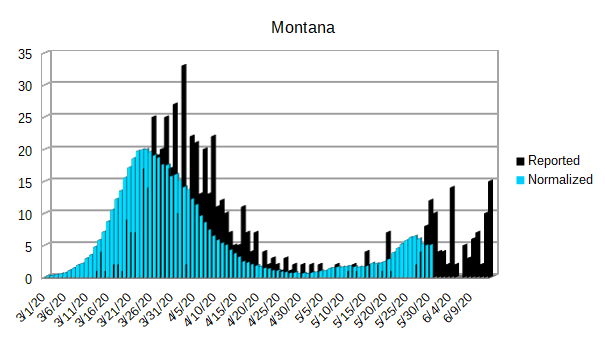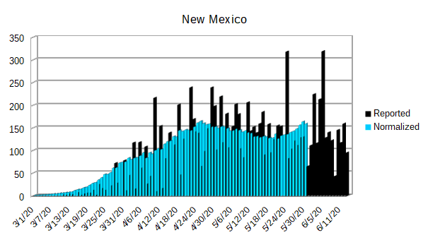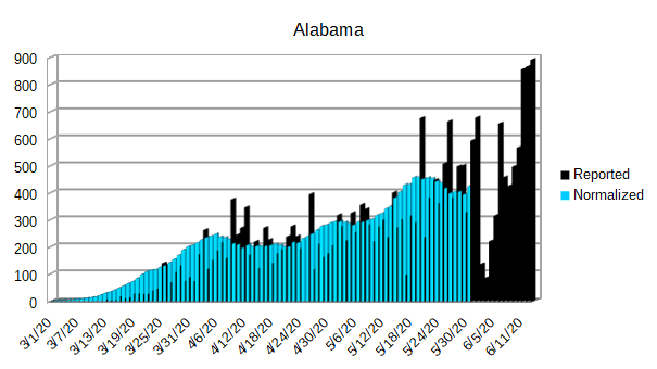 Alabama looks like it is about to get worse. The recent spike in reported cases hasn’t been completely integrated into the normalized daily infection rate, but it appears as if their trend is going up.