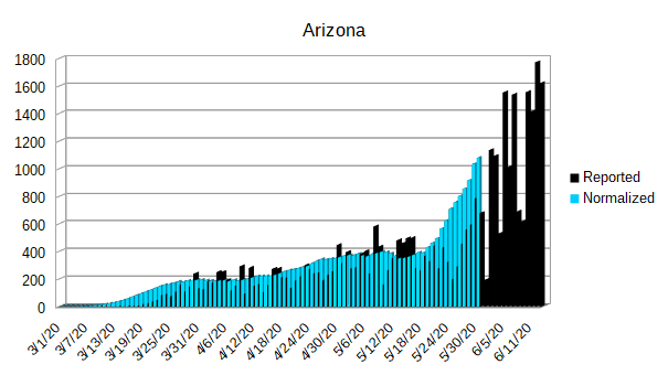 Arizona seems to be continuing its rapid infection rate that started about a month ago. They have already taken their place in the top five worst states for daily infections. At this rate, they will soon be in a race for first with California and Texas.