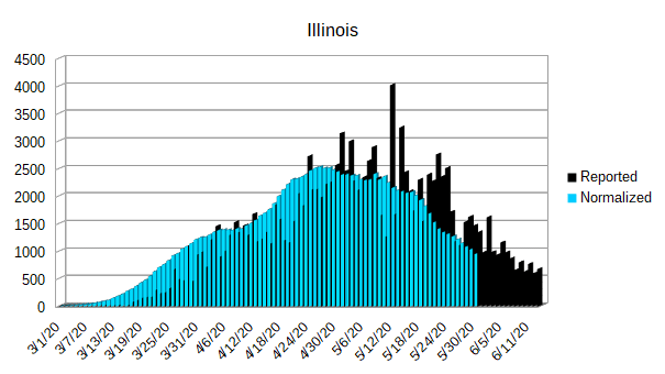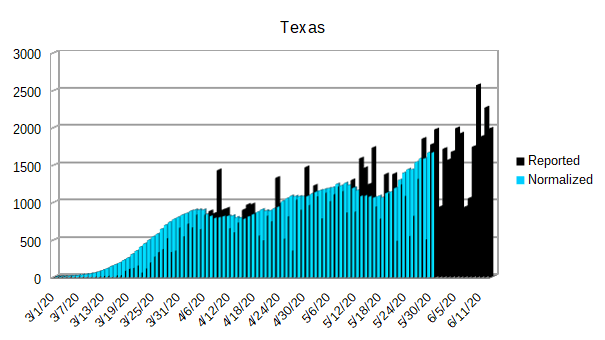 As you can see, there are a lot of changes from last week. While California still has the worst normalized daily infection rate, Texas moved up to the number two slot. Illinois, New York, and Virginia have each regained enough control of their infections that all three dropped out of the top five. They were replaced by Florida, Arizona, and North Carolina.