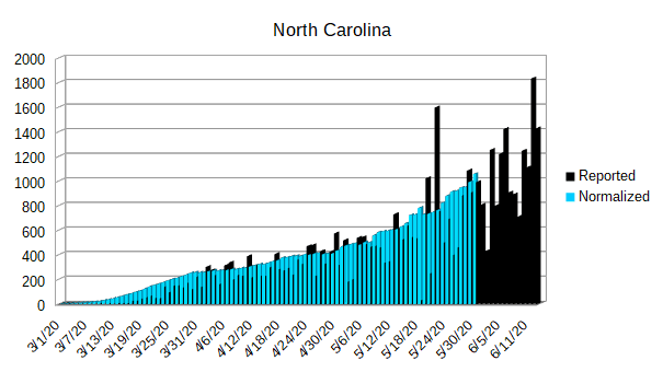 North Carolina, like California, continues to see their daily infection rates climb. They still haven’t managed to ever reach an initial peak and begin to lower their daily infection rates. Unfortunately, as of now, they are also in the top five worst states for normalized daily infection rates.